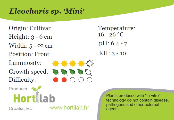 Eleocharis sp. Mini je na pěstování středně obtížná rostlina, která je v akvaristice relativně nová. Je vzhledově podobná jako Eleocharis parvula, ale má nižší vzrůst. Vytváří krásný, zelený a svěží koberec. Své uplatnění najde mimo jiné v Iwagumi akvariích (kde jediným hardscape materiál je kámen). Nicméně, pro hustý porost, je nutné intenzivní světlo.