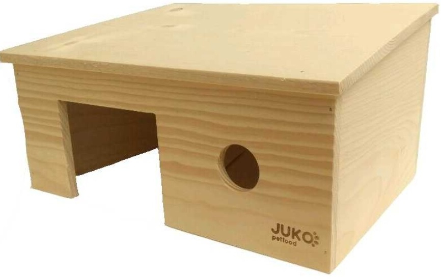 Domeček s šikmou střechou která lépa navozuje lépe pocit skutečného domu. Sklon není velký, zvířátko ji tedy i přesto může používat. Domeček je vhodný pro králíka a hlodavce podobné velikosti. Materiál: vyzrálé vysušené smrkové dřevo - hladce obroušené, bez povrchové úpravy. Rozměry: 31 x 17 x 22,5cm (šířka, výška, hloubka)