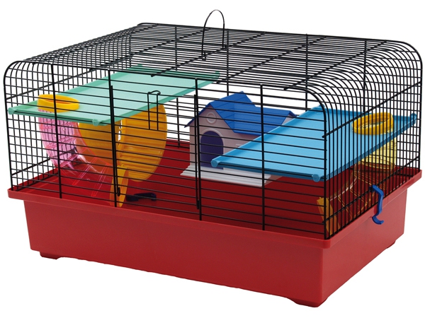 Klec pro malá zvířata a hlodavce. Velikost: 49 x 32,5 x 29 cm. Rozteč mezi dráty: 1,2 cm. Včetně výbavy - patro, kolotoč, domeček, skluzavka.