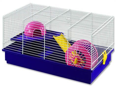 Klec pro křečky a jiné malé hlodavce. Velikost 50,5 x 28 x 25 cm. Včetně vybavení - domek, patro, skluzavka, kolotoč a miska. Mezera mezi dráty 10 mm. Barva dle momentální nabídky. Obrázek je pouze ilustrační.