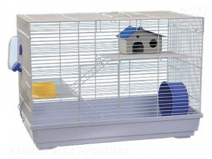 Klec pro křečky s vybavením - domeček, miska, napáječka a kolotoč. Velikost: 58 x 32 x 41 cm. Klec se dodává v rozloženém stavu. Barva dle momentální nabídky. Obrázek je pouze ilustrační.