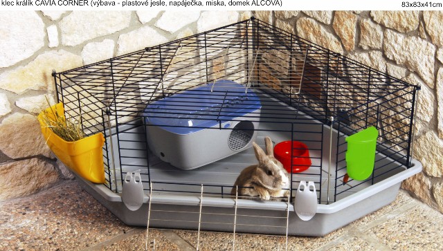 Velká klec pro králíky, morčata ... Velikost 83 x 83 x 41 cm. Součástí klece jsou plastové jesličky, napáječka, miska a domek Alcova. Otevírání klece z boku a z vrchu. Barvené dráty, barva spodní části dle momentální nabídky. Kvalitní zpracování.