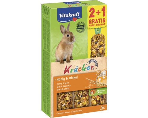 Cereální tyčinky pro králíky, které jsou třikrát jemně pečené v troubě. Obsahují nejlepší obiloviny, semena, med. Kräckery jsou na přírodním dřívku s praktickým držákem. Složení: Obilniny (1,6% špalda), vedlejší produkty rostlinného původu, ovoce, 1,1% minerály, semena, zelenina, 0,33% med.