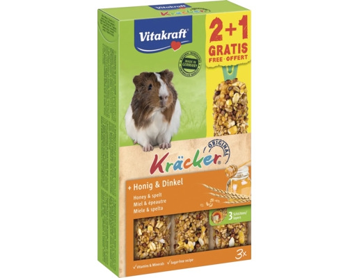 Cereální tyčinky pro morčata, které jsou třikrát jemně pečené v troubě. Obsahují nejlepší obiloviny, semena, med. Kräckery jsou na přírodním dřívku s praktickým držákem.