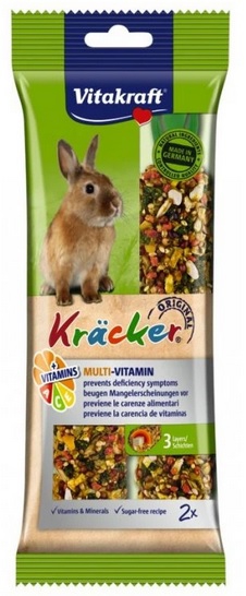Multi-vitamínové tyčinky pro králíčky. VÝTEČNÉ TYČINKY K OHLODÁVÁNÍ Tyčinky jsou výtečnou pochoutkou a zároveň hračkou. králíčci si při ohlodávání musí potravu "dobývat" jako v přírodě. Doplňkové krmivo pro králíčky. Speciální tyčinky na hlodání s A, C, E - vitamíny. Krmný návod: umístěte do klece a nechte volně k dispozici. Vitamínová tyčinka: Složení: obiloviny, cereálie, minerály, vedlejší výrobky rostlinného původu, ořechy, zelenina, ovoce. Jakostní znaky: hrubé proteiny 11,4%, vlhkost 12,5%, hrubé oleje a tuky 5,1%, hrubé popeloviny 5,5%, hrubá vláknina 3,9%, vápník 1,46%, fosfor 0,54%, vitamín A 7642m.j./ kg, vitamín D3 554 m.j./ kg, vitamín C 650 mg, vitamín B2 4,6 mg, vitamín B6 4,8 mg, vitamín E (alfatokoferol) 80,1 mg / kg, měď 0,5 mg / kg.