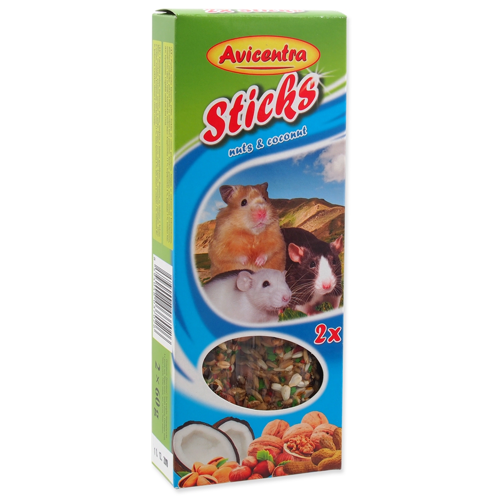Tyčinky s ořechy pro pro křečky, myši, potkány a další malé hlodavce. Doplňkové krmivo pro malé hlodavce. Tyčinky s ořechy jsou pochoutkou, výživným krmivem a hračkou zároveň. Jsou vyrobeny z bohaté směsi zrnin a dalších přírodních surovin, včetně medu s přirozenými zdroji vitamínů a minerálií a proto jsou nepostradatelným doplňkem každodenní stravy. Tyčinky jsou speciální krmivo, kde musí Váš mazlíček vyvinou úsilí k získání své potravy podobně jako v přirozeném prostředí. To napomáhá jeho fyzické a psychické kondici. Krmný návod: do klece zavěste 1 - 2 tyčinky za týden. Složení: obiloviny, semena, ořechy, pekařské výrobky, med, minerální látky. Jakostní znaky: vlhkost 12%.
