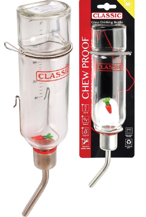 Výběrová řada skleněných napáječek pro hlodavce:- láhev vyrobena ze skla- kovové pítko s kuličkou - neteče a nelze ho rozkousat (garantováno výrobcem)- kovový uzávěr s kvalitním plastovým těsněním- indikátor hladiny ve tvaru mrkvičky (uvnitř láhve)- bezpečný dvoudílný závěs na klec (kovová pružina a háčky)- možno mýt v myčce Rozměry: 175ml - Výška: 22 cm. Průměr: 5 cm 350ml - Výška: 30 cm. Průměr: 6 cm 750ml - Výška: 32 cm. Průměr: 8 cm