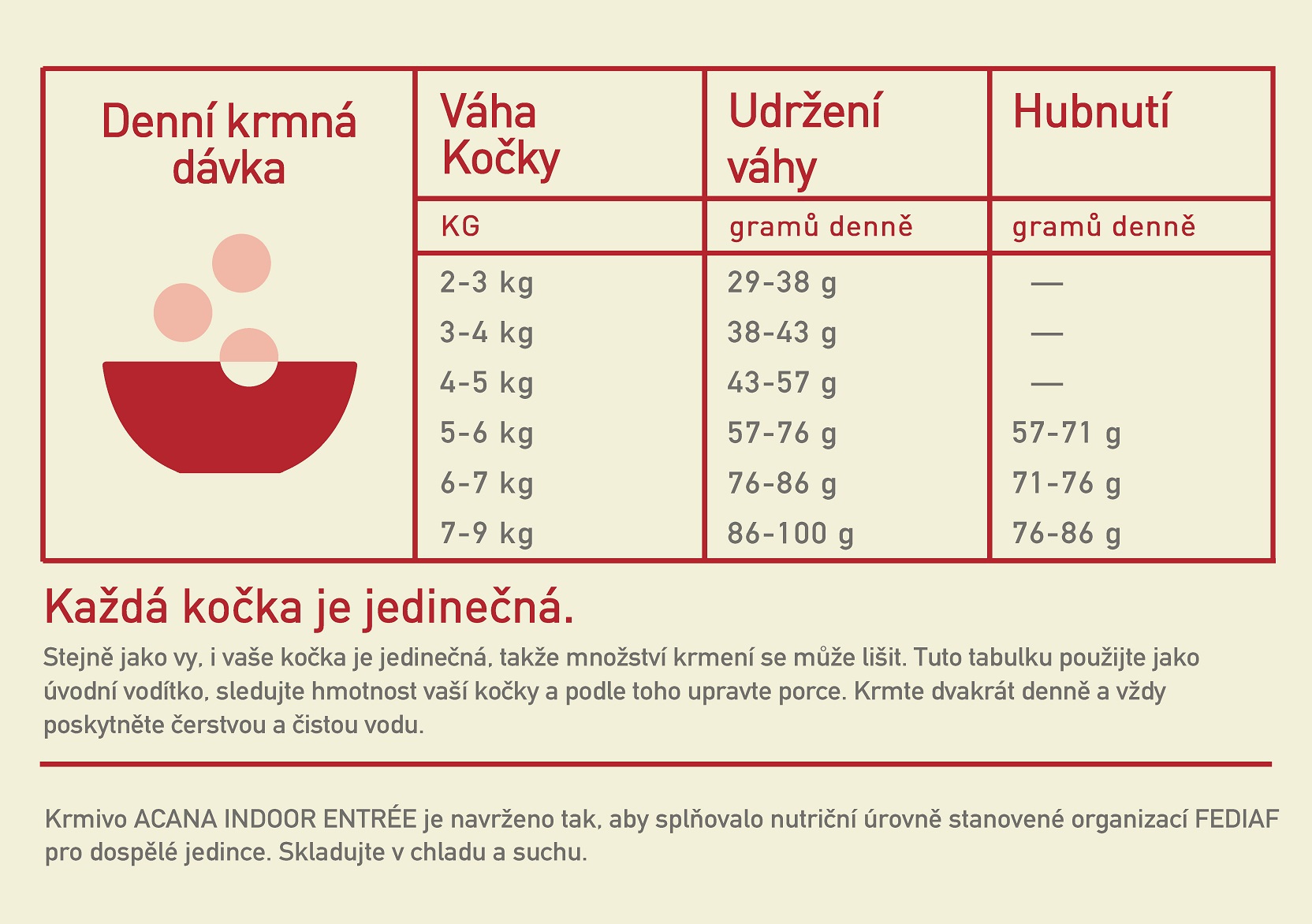 ACANA INDOOR ENTRÉE CAT - volně chované kuře, krůta a králík. KOMPLETNÍ KRMIVO PRO KASTROVANÉ KOČKY A KOČKY POHYBUJÍCÍ SE PŘEVÁŽNĚ V DOMÁCNOSTI Maso je vždy naší ingrediencí č. 1. Nová receptura ACANA INDOOR ENTRÉE je plná volně chovaného kuřete a krůt, doplněná o lahodného králíka. To vše v poměru celé kořisti (maso, orgány, chrupavky a kosti), který přirozeně vyživuje vaši kočku. Díky krmivu ACANA Indoor Entrée poskytnete kočce všechny živiny, které potřebuje. A věřte, že díky lahodné chuti si toto krmivo vaše kočka jednoduše zamiluje! Složení: Čerstvé kuřecí maso (16 %), dehydrované kuřecí maso (16 %), dehydrovaný sleď (16 %), oves, celý hrách, kuřecí tuk (5 %), tráva miscanthus, zelená čočka, čerstvé krůtí maso (4 %), syrový sleď (4 %), cizrna, červená čočka, vláknina z čočky, syrový králík (1 %), čerstvé kuřecí droby (játra, srdce) (1 %), čerstvé krůtí droby (játra, srdce) (1 %), kuřecí chrupavka (1 %), sušená řasa, čerstvá máslová dýně, čerstvá dýně, čerstvé brusinky, čerstvé borůvky. Doplňky (na kg): technologické doplňky s přírodními antioxidanty a nutriční doplňkové látky: Cholin chlorid: 1200mg, Taurin: 400 mg, Hydrát chelátu zinku a aminokyselin: 150 mg, Vitamin B1: 25 mg, Vitamin B2: 10 mg, Niacin: 50 mg, Vitamin B5: 8 mg, Vitamin B6: 7.5 mg, kyselina listová: 0.75 mg, Biotin: 0.03 mg, Vitamin B12: 0.1 mg, Vitamin A: 1875 IU, Vitamin D: 250 IU, Vitamin E: 175 IU, Chelát mědi a aminokyselin: 11 mg, L-carnitine: 50 mg, DL-methionine: 99 mg. Zootechnické doplňkové látky: Enterococcus faecium NCIMB10415: 600x10 6CFU. Analytické složky: Hrubý protein - 37 % Obsah tuku - 14 % Hrubá vláknina - 6 % Hrubý popel - 9 % Vlhkost - 10 % Vápník - 1.4 % Fosfor - 1 % Magnesium - 0.1 % Taurin - 0.1 % Omega 6 - 2 % Omega 3 - 0.5 % DHA / EPA - 0.2 % / 0.1 % Obsah kalorií: Využitelná energie je 3630 kcal/kg (414 kcal per 250ml/114g odměrku)