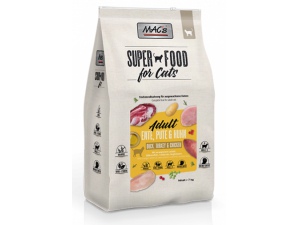 Kompletní krmivo pro dospělé kočky – Kachna, krůta, kuře. Pro kočky, které dávají přednost masu z drůbeže. S lososovým olejem, brusinkami a horskými bylinkami. Všechna suchá krmiva MAC´s jsou GRAIN FREE – bez obilí. Všechna suchá krmiva MAC´s obsahují přírodní ingredience omezující tvorbu trichobezoárů, chlupových chomáčků v žaludku kočky. Kompletní suché krmivo pro každodenní špičkové krmení dospělé kočky. Základní vyvážená strava pro nejlepší kondici, pro zdravý, dlouhý a aktivní život kočky. Velmi dobře přijímáno vybíravými a mlsnými kočkami a kočkami s poruchami příjmu potravy – alergie, hypersenzitivity, nechutenství, v nemoci, ve stresu apod. Ingredience Drůbež (46%, z toho 28% drůbeží moučka, 6% krůtí moučka, 6% kachní moučka, 6% drůbežího tuku), bramborové vločky (13,5%), hrách (13%), sladké brambory (13%), celuloza, brusinky (celé, sušené 2,5%), olej z norského lososa (2,5%), kvasnice, krevety (2%), horská bylinná směs (1%), stopové prvky, vitamíny a minerály, FOS, tripolyfosfát sodný (0,2%), Spirulina, Yucca Schidigera , taurin, L-karnitin, zelená pyskatá mušle. Deklarované jakostní znaky Hrubý protein 32 %, oleje a tuky 13 %, hrubý popel 7 %, hrubá vláknina 4,5 %, vlhkost 8 %, vápník 1,3 %, fosfor 1,2 %, hořčík 0,06 %, EPA 0,1 %, DHA 0,12 %, Omega 3 1,2 % Nutriční doplňkové látky: měď (jako sítan měďnatý pentahydrát) 10 mg/kg, zinek (jako oxid zinečnatý) 75 mg/kg, Mangan (jako oxid manganatý) 60 mg/kg, jód (jako jodičnan vápenatý bezvodý) 1,4 mg/kg, Vitamin A 20.000 IE, Vitamin D 1.400 IE, Vitamin E (jako alfa-tokoferol acetát) 180 mg/kg, Taurin 1.500 mg/kg, L-Carnitin 500 mg/kg, Selen (jako seleničitan sodný) 0,1 mg/kg