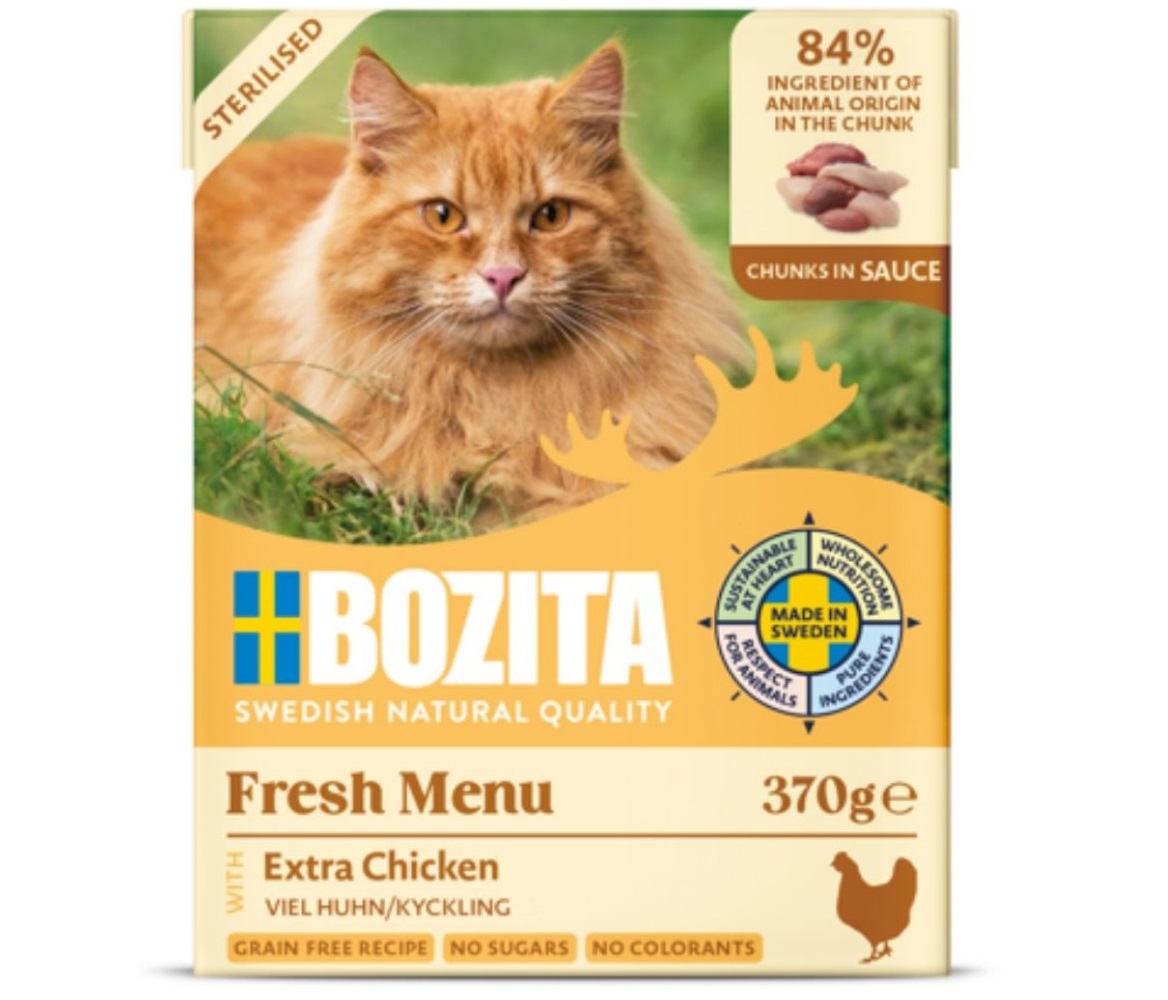 Bozita Cat Sterilised chutné kompletní mokré krmivo přizpůsobené pro sterilizované kočky. Připravené z vysoce kvalitních surovin a 84 % složek živočišného původu v kouscích.