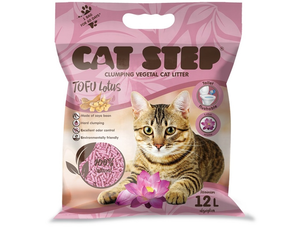 Rozšíření kvalitní biologicky odbouratelné podestýlky Cat Step Tofu o variantu s jemným lotusovým aroma. Stelivo je vyrobeno ze sojové odpadní drti a nabízí maximální komfort pro kočky i jejich majitele. - Vyrobeno ze sojové vlákniny (tofu) - Vysoká absorpční kapacita - Účinně pohlcuje zápach - Bez chemických přísad, zcela bezpečné pro zvířata i lidi - Snadná likvidace – hrudky se ve vodě okamžitě rozpadají a lze je spláchnout do WC - Extrakt z lotosu dodává svěží přírodní vůni Použití: Do čisté a suché toalety nasypte stelivo ve vrstvě 3–5 cm. Pravidelně odstraňujte hrudky a doplňujte nové stelivo. Upozornění: Hrudky je nutné splachovat po menším množství. Složení: sojová vláknina (tofu), potravinářský škrob, voda
