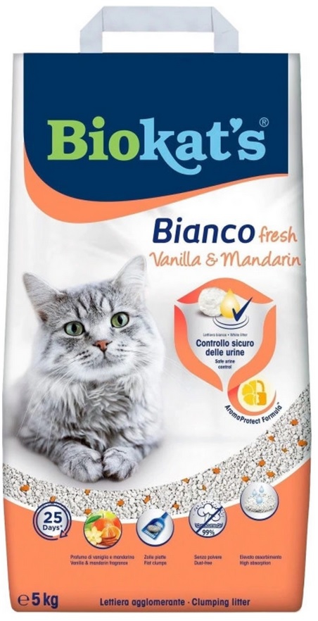Hygienická, pezprašná, přírodní - mnohoúčelová podestýlka s vysokou savostí z vysoce kvalitního přírodního jílu. Hrubozrnná, světlé barvy s jemnou a velice příjemnou vůní vanilky a mandarinky. Velmi dobrá absorpce díky specifickým vlastnostem nejkvalitnějšího přírodního jílu. Kvalitní pohlcování pachů s čistě přírodními surovinami! Biokats vytváří velmi stabilní hrudky, které se snadno odstraňují. Doporučujeme stelivo nanášet do toalety v 7 cm vrstvě. Použití: Do důkladně vyčištěné kočičí toalety nasypeme vrstvu podestýlky (5 cm). Po vykonání potřeby vznikne hrudka, která se po ztuhnutí a zahrabání kočkou vybere lopatkou. Upozornění: Nevhodné ke kompostaci a splachování v toaletě, použité stelivo odhazujte do komunálního odpadu.