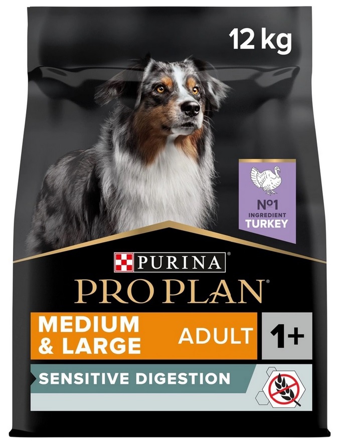Granule pro psy Pro Plan medium & large sensitive digestion grain free je ideální volba pro velká a středně velká plemena s citlivým zažíváním. Granule mají vysoký obsah krůtího masa a optimální kombinaci živin pro podporu zdravého trávení a pomohou udržovat vašeho domácího mazlíčka v ideální kondici. Díky obsaženým prebiotikům upravují střevní mikroflóru a podporují správné vyprazdňování. Pro Plan medium & large sensitive digestion grain free mohou jíst i březí nebo kojící feny.