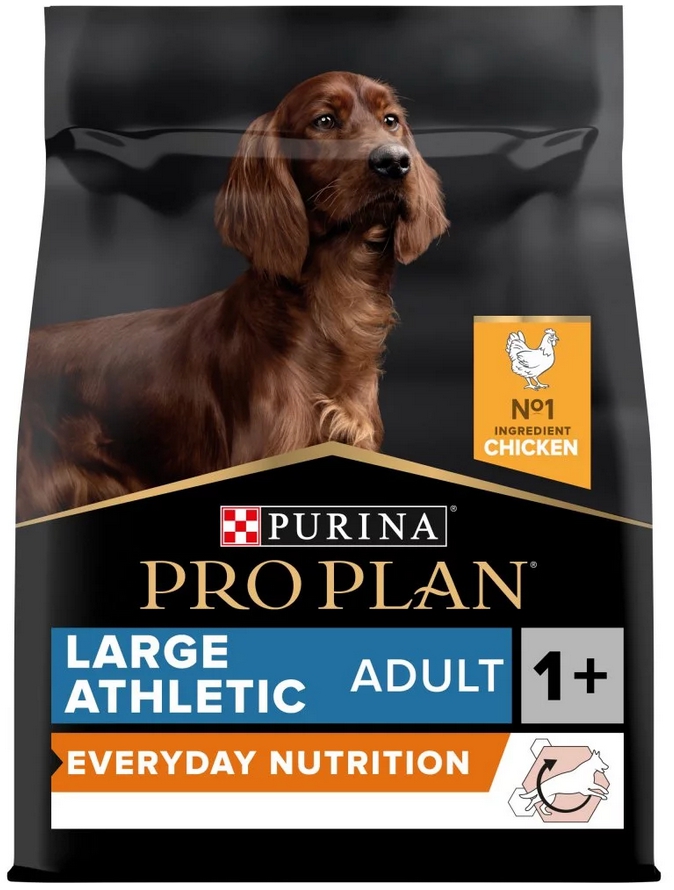 Krmivo Purina PRO PLAN® Everyday Nutrition LARGE ADULT ATHLETIC bylo vyvinuto pro dospělé psy velkých sportovních plemen (s hmotností nad 25 kg). Granule obsahují vitamín D, minerální látky a specifické množství omega-3 kyselin (0,3 %), které přispívají ke zdraví zubů a dásní. Krmivo má vysoký podíl kvalitního kuřecího masa, a tak zajišťuje optimální výživu velkých plemen od 24 měsíců až do 7 let. Následně byste měli přejít na produkty z řady Age Defence.