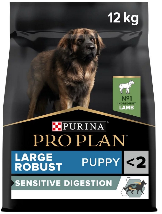 Krmivo Purina PRO PLAN® Sensitive Digestion LARGE PUPPY ROBUST bylo vyvinuto pro štěňata velkých, robustních plemen (s hmotností v dospělosti nad 25 kg). Granule pro štěňata obsahují vitamín D a minerální látky, které podporují silné a zdravé zuby. Krmivo má velký podíl vysoce kvalitního jehněčího, a tak zajišťuje optimální výživu štěňat velkých psů. To vše až do věku 24 měsíců, kdy přejdou na produkty řady ADULT.