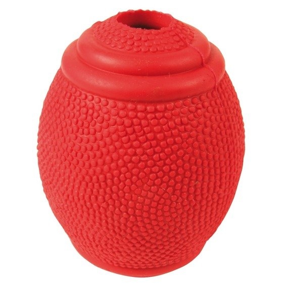 Rugby míč na pamlsky z tvrdé gumy. Velikost 8 cm. Barva červená.