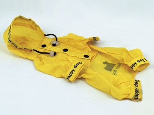 Žlutá pláštěnka pro psy s kapucí. Různé velikosti (měří se od krku ke kořeni ocasu). Doporučujeme objednávat pláštěnku o velikost větší, materiál se nenatáhne. Materiál šusťák.