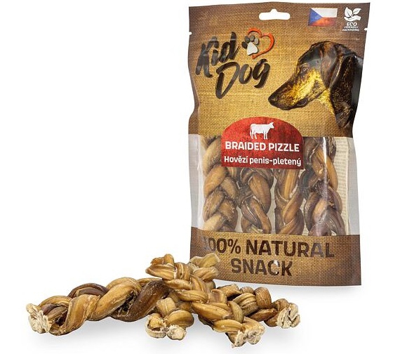 KIDDOG NATURAL SNACK je vysoce kvalitní pamlsek, 100 % přírodní produkt šetrně sušený teplým vzduchem. Neobsahuje žádné konzervanty a barviva. Je oblíbeným doplňkem stravy, a to díky své specifické vůni a chuti. V zapletené variantě se stává odolnějším a efektivnějším nejen pro posilování žvýkacích svalů. Pomáhá také čistit zuby od zubního plaku.