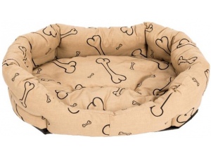Pohodlný, kvalitní pelech vyrobený z bavlněné látky s potiskem kostí, vyplněný dutým vláknem. Pelíšek je v několika bodech prošitý, aby nedošlo k nerovnoměrnému rozmístění výplně. Polštářek je vyjímatelný. Boky pelíšku jsou kvůli dobré opoře bohatě vyplněny. Pelech se lehce udržuje.