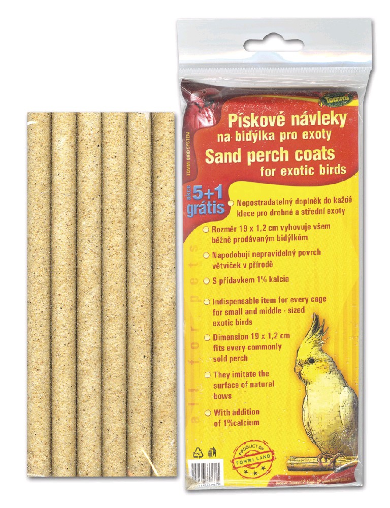 Pískové návleky na bidýlka pro exoty. Nepostradatelný doplněk do každé klece pro drobné a střední exoty. Rozměr 19 x 1,2 cm vyhovuje všem běžně prodávaným bidýlkům. Napodobují nepravidelný povrch větviček v přírodě. S přídavkem 1% kalcia. Rozměry: 19 x 1,2 cm Balení: 6 ks (5 ks + 1 ks GRÁTIS)