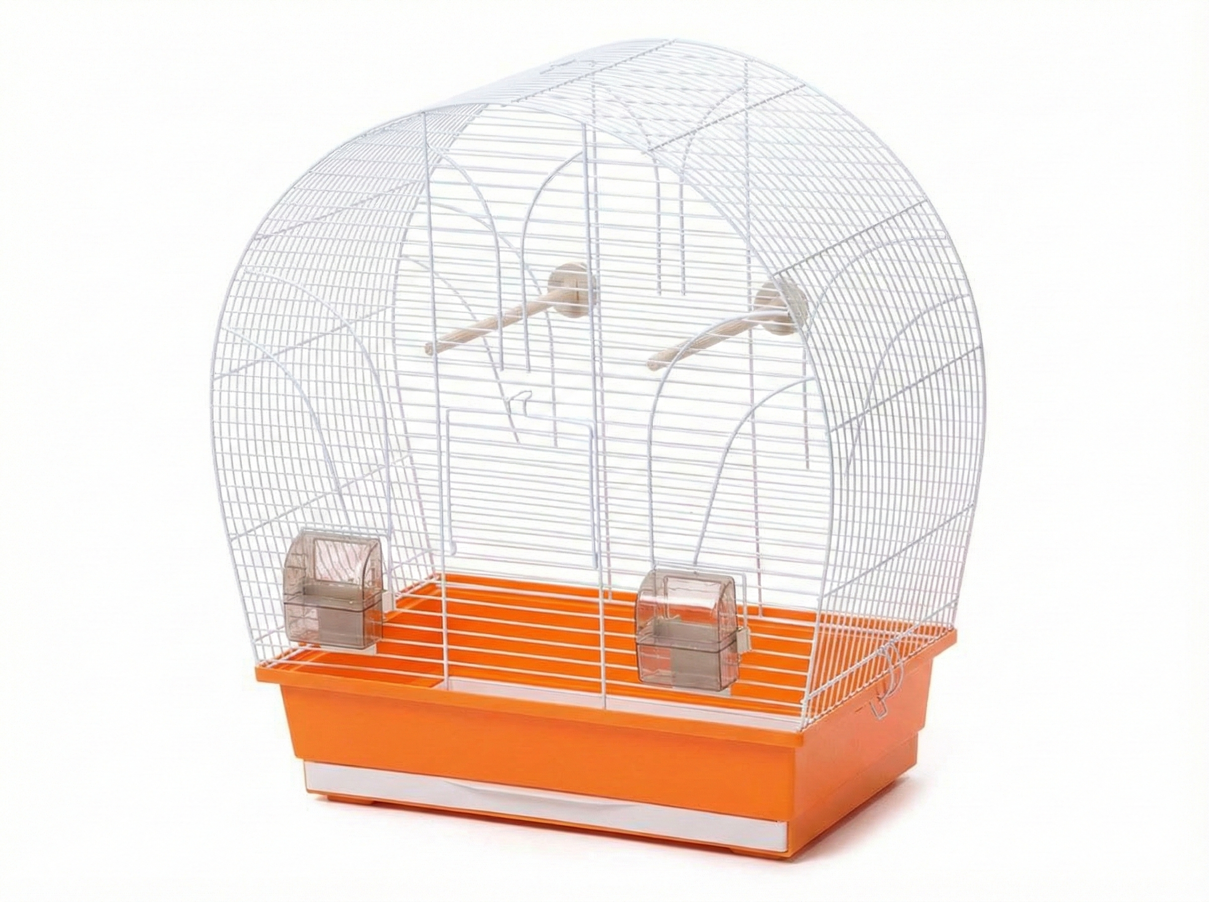 Klec vhodná pro kanáry, zebřičky a jiné malé papoušky. Rozměry 55 x 28 x 51 cm. Dno oranžové, dráty bílé. Výbava: 2x krmítko, 2x bidýlko.