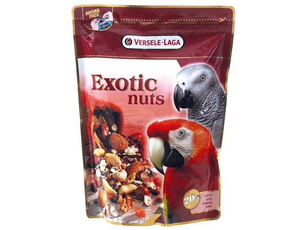 Směs s celými ořechy, obilovinami a semeny pro velké papoušky. Doplňkové krmivo pro velké papoušky. Versele-Laga Exotické Nuts je pochoutka, kterou papoušci prostě milují. Vyžadují dostatek různých druhů celých ořechů, ale stejně si vychutnají i bohatou směs zrnin a semen. Krmný návod: podávejte jako krmivo či odměnu spolu s ostatními krmivy Versele-Laga. Složení: semena, obiloviny, ořechy (min. 20% směsi arašídů, lískových oříšků, para ořechů, pekanových ořechů, vlašských ořechů, mandlí, cedrových ořechů, ovoce, zelenina. Jakistní znaky: hrubé proteiny 13%, hrubé oleje a tuky 20%, hrubé popeloviny 3%, hrubá vláknina 14%, vápník 0,1%, fosfor 0,3%.