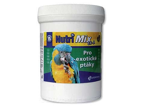 Vitamínový přípravek pro exotické ptáky. Doplňkové krmivo pro ptáky. Obsahuje komplex vitamínů, makro a mikroprvků, aminokyselin a dalších vybraných biologicky aktivních látek. Dále je obohacen o bylinný přípravek BIOSTRONG (podpora dýchacího aparátu), sušené pivovarskíé kvasnice a přípravek LBC - podpora trávícího aparátu. Krmný návod: drobní ptáci - 0,2 g, malí ptáci - 0,4 g, střední ptáci - 0,6 g, velcí ptáci - 1 g denně přimíchat do krmiva. Jakostní znaky: vitamín A 550000 m.j./ kg, vitamín D3 48000 m.j./ kg, vitamín E (alfatokoferol) 6000 mg / kg, vitamín K 400 mg / kg, vitamín B1 130 mg / kg, vitamín B2 800 mg / kg, vitamín B6 270 mg / kg, vitamín B12 1700 mcg / kg, vitamín C 6700 mg / kg, biotin 5300 mcg / kg, niacin 270 mg / kg, pantotenan vápenatý 530 mg / kg, kyselina listová 80 mg / kg, inostiol 1000 mg / kg, cholinchlorid 16000 mg / kg, beta-karoten 200 mg / kg, vápník 41000 mg / kg, fosfor 24000 mg kg, sodík 9000 mg / kg, hořčík 9200 mg / kg, železo 800 mg / kg, zinek 1200 mg / kg, mangan 1200 mg / kg, měď 70 g / kg, kobalt 25 mg / kg, selen 25 mg / kg, jód 12 mg / kg, DL-methionin 53000 mg / kg, L-lysin 76000 mg / kg, carophyll RED 100 mg / kg, carophyll YELLOW 1000 mg / kg.