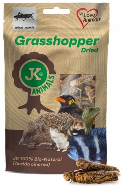 Sušená sarančata. 100% Bio-přírodní doplňkové krmivo s vysokým obsahem bílkovin pro plazy, malé savce, ryby, ptáky a drůbež. Bez umělých přísad a barviv. Složení: 100% saranče. Analytické složky: hrubý protein 57,6 %, hrubý tuk 15,8 %, hrubý popel 8,9 %, hrubá vláknina 3,3 %, vlhkost 5,9 %.