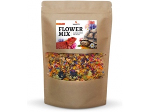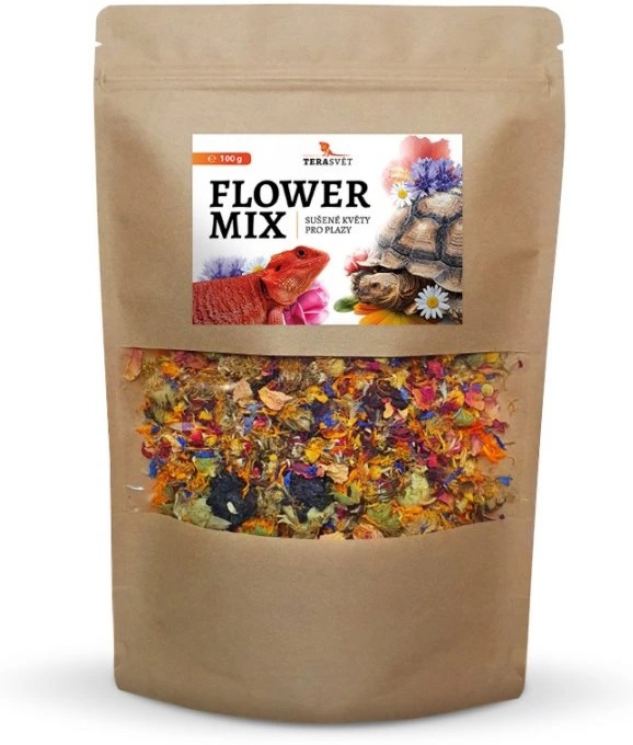 Prémiový mix sušených květů pro býložravé ještěry a želvy. Směs sušených květů vhodná jako doplňkové krmivo pro všechny ještěry, želvy a savce živící se rostlinnou potravou. Sušené květy obsahují oproti čerstvým větší množství vlákniny. Vláknina stimuluje trávící systém, zlepšuje apetit a zvyšuje odolnost vůči onemocněním. Tento doplněk obohatí nabízenou potravu zejména v zimních měsících, kdy není možné krmit volně rostoucími bylinami. Pestrý výběr květů v optimálním poměru poskytuje zvířatům důležité přírodní vitamíny a minerály. Oproti směsím jiných značek je oblíbený ibišek nasekán nadrobno. V sušené formě je totiž poměrně tvrdý a o velký kusy nemusí zvířata jevit zájem. Vhodné pro: suchozemské želvy, agamy vousaté, leguány zelené, trnorepy, čukvaly a další druhy. Složení: ibišek, měsíček lékařský, smetánka lékařská (pampeliška), okvětní lístky růže, chrpa, topolovka, heřmánek lékařský. Hmotnost: 100 g. NÁŠ TIP: Přimíchejte tyto sušené květy k čerstvě nasekané rostlinné potravě, tím výrazně zlepšíte výživové hodnoty. Navíc můžete přidat i speciální směs bylin v poměru s květy 1:1.