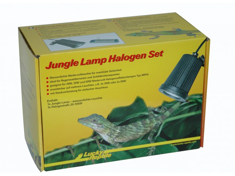 Vodotěsný reflektor pro halogenové žárovky, určený pro použití ve vlhkých teráriích a akvateráriích s vodními želvami. Jungle Lamp je nízkovoltážní (12 V), potřebuje tedy pro provoz trafo. Instalace uvnitř terária je velmi snadná, díky otočnému ramenu, které Jungle Lamp drží. Můžeme tedy reflektor pohodlně natáčet požadovaným směrem. V nabídce je sada Jungle Lamp Set, která obsahuje 1× Jungle Lamp (reflektor) a 1× transformátor. Další reflektory Jungle Lamp lze dokoupit zvlášť. Na jedno trafo lze napojit až 5 reflektorů Jungle Lamp do celkové wattáže 105W. Můžete tedy využívat např. následující kombinace wattáží napojených Jungle Lamp: 5×20W 3×35W 2×50W apod. Jungle Lamp je konstruována pro použití s Halogen Sun LV.