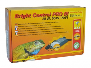 Nejnovější modelová řada elekronického předřadníku pro lampy Bright Sun UV. Lze použít pro 3 různé wattáže lamp (35W, 50W a 70W). Elektronický předřadník pro metalhalidové výbojky s vestavěným inteligentním čipem chrání lampy, prodlužuje jejich životnost a zajišťuje optimální světelné spektrum po celou dobu životnosti lampy. Bright Control PRO III. je přepínací, tzn. každý může být použit pro Bright Sun UV 35W nebo 50W nebo 70W. Pozor, lampy nemohou být použity zároveň, jeden předřadník vždy na jednu lampu, ale je možné přepínat mezi wattážemi. Výhoda spočívá v tom, že např. v zimě potřebujeme v teráriu silnější wattáž a svítíme tedy lampou 70W, ale v létě můžeme pouze vyměnit lampu za slabší a použít pro ni stejný předřadník, pouze na něm přepneme tlačítko. Při použití elektronického převodníku zůstává světelné spektrum metalhalidových lamp konstantní po celou dobu jejich garantované životnosti. Naproti tomu při použití elektromagnetického předřadníku vykazují halidové lampy změnu spektra, zejména ke konci životnosti. Pouze elektronický předřadník jako je Bright Conrol PRO III. zajistí tu nejlepší kvalitu světla po celou dobu provozu. Navíc tento předřadník automaticky vypne lampy, které se poškodí nebo nebudou správně fungovat (z bezpečnostních důvodů). Vyšší pořizovací náklady na tento výrobek se Vám zakrátko vrátí zpět díky prodloužené životnosti lamp, jejich perfektní funkčností a bezchybnou činností. Bright Control PRO III. není nutné obměňovat, pravidelně se mění pouze lampy. Lampy Bright Sun nemohou fungovat bez předřadníku. Je možné i jejich vlastní zapojení, takové však není výrobcem garantováno.