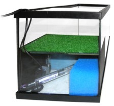 Skleněné terárium pro želvy a obojživelníky s výbavou. Součástí želvária je ostrůvek, schůdky, filtr, topítko a krycí sklo nad částí s ostrůvkem. Plastové okraje pro vyšší bezpečnost. Součástí nejsou dekorace uvedené na obrázku (písek, rostlina, pozadí, želva). Rozměry 61 x 31 x 26 cm. Hmotnost 8,7 kg.
