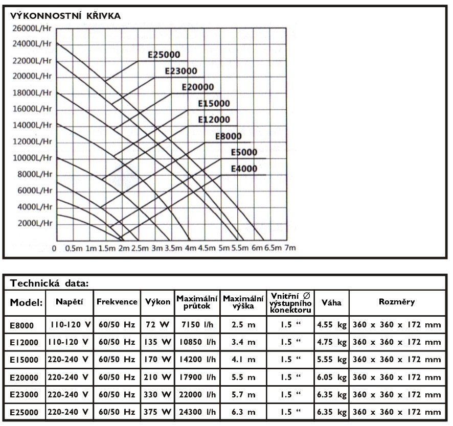 Jezírkové čerpadlo E 8000Výhody jezírkového čerpadla série E:- velký průtok- vysoká efektivita- energetická úspora- stabilita- celková robustnost a odolnost- schopnost čerpat vodu s nečistotami o zrnitosti až do 8 mmTechnická data:Napětí: 110-120 VFrekvence: 60/50 HzVýkon: 72 WMax. průtok: 7150 l/hMax. výška: 2,5 mVnitřní průměr výstupního konektoru: 1,5“Váha: 4,55 kgRozměry: 360 x 360 x 172 mmDélka přívodního kabelu cca: 9,8 m
