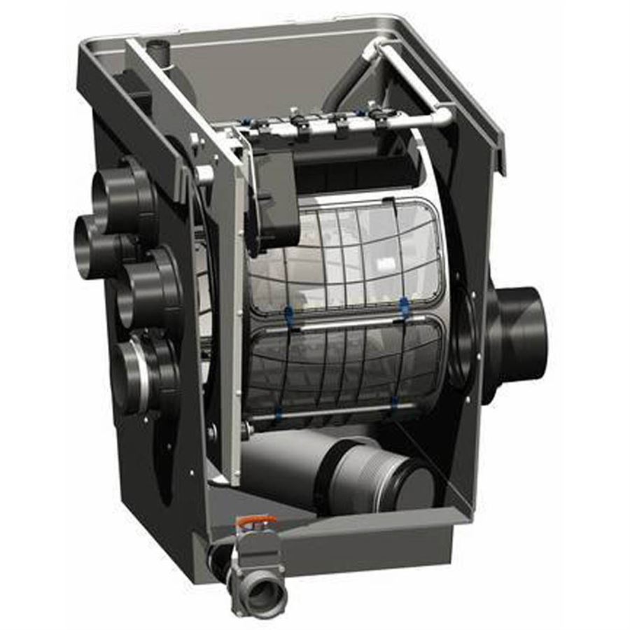 Bubnový filtr pro gravitační zapojení s průtokem až 33000 l/h zajišťuje vysoce účinnou mechanickou filtraci se separací nečistot o velikosti 60 µM a kompaktními rozměry.