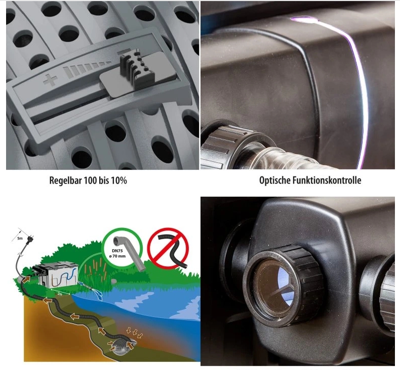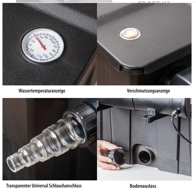 Sada průtokové filtrace HEISSNER FPU40000-00, do objemu jezírka 40 m³, s rybami 20 m³, s koi kapry 10 m³, konstrukce umožňuje filtr z 80 % zakopat a tím ho skrýt, navíc přímo z něho za pomocí hadice můžete napájet vodopád do převýšení 1,5 m, sada s čerpadlem, UV lampou, hadicí, rozměry 40 x52 x 136 cm, čerpadlo 10 000 l / h, 95 wattů, UV lampa 36 wattů, univerzální hadicová přípojka, zobrazení stupně znečištění, systém rychlého čištění „EASY CLEAN“, regulovatelné filtrační čerpadlo. Již více než 145 let je značka Heissner symbolem inovace, kvality a vášně pro vodní prvky v zahradě. Tento německý výrobce patří mezi špičku v oblasti jezírkové techniky, kde kombinuje moderní technologie s ekologickými řešeními. Od solárních čerpadel, přes filtrační systémy až po inteligentní osvětlení – Heissner nabízí širokou škálu produktů, které oživí každé zahradní jezírko a přemění ho v harmonickou oázu klidu. S důrazem na udržitelnost, energetickou úspornost a jednoduchou instalaci přináší řešení, díky nimž si můžete užívat krásu vody bez zbytečných starostí. Heissner FPU40000-00 – výkonná průtoková filtrace pro křišťálově čisté jezírko Chcete mít čistou a zdravou vodu ve vašem zahradním jezírku? Průtoková filtrace Heissner FPU40000-00 je výkonné řešení, které efektivně odstraňuje nečistoty, řasy i škodlivé bakterie. S kapacitou až 40 m³ a výkonem 10 000 l/h je ideální pro větší jezírka s rybami i okrasné vodní plochy. Díky integrované 36W UV-C lampě zajišťuje křišťálovou vodu bez řas a zákalu. - Vysoký výkon – 10 000 l/h – ideální pro jezírka až do 40 m³ - Účinná filtrace – mechanická i biologická filtrace pro optimální kvalitu vody - UV-C technologie 36 W – eliminuje řasy, bakterie a choroboplodné zárodky - Snadná údržba – jednoduchý systém čištění a praktická kontrola znečištění - Odolná konstrukce – robustní provedení pro dlouhou životnost Technické parametry: - Kapacita jezírka: až 40 000 l (bez ryb), 20 000 l (s rybami), 10 000 l (s koi kapry) - Průtok čerpadla: 10 000 l/h - Výkon UV-C lampy: 36 W - Filtrační média: pěnové vložky a biomedium pro biologickou filtraci - Rozměry filtru: 55 × 38 × 40 cm - Délka kabelu UV-C lampy: 5 m - Připojení hadice: 25/32/38 mm - Maximální tlak: 0,3 bar - Provozní teplota: 4–35 °C - Hmotnost: 7,5 kg Užijte si křišťálově čistou vodu ve vašem jezírku bez námahy! Heissner FPU40000-00 se postará o průzračnou vodu, zdravé ryby a krásné vodní rostliny – a vy si můžete naplno vychutnat krásu své zahrady.