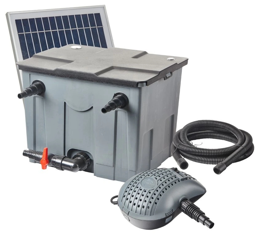 Solární sada průtokové filtrace Heissner SF8000-00 je hybridní a snadno použitelný systém pro zahradní jezírka do objemu 8 m³ (s rybami 4 m³), filtrace včetně 4 filtračních hub, výkon čerpadla 3500 l/h, 2x 18V krystalický solární panel, d × š × v 52 × 40 × 40 cm, hadice a hadicové přípojky. Přes den pracuje na solární energii a v noci se automaticky přepne přes adaptér na energii ze sítě, takže zajišťuje efektivní cirkulaci vody 24 h denně. Solární hybridní sada průtokové filtrace Heissner SF8000-00 představuje moderní a energeticky úsporné řešení pro čistou a zdravou vodu v zahradních jezírkách. Systém využívá kombinovaný provoz – přes den běží na solární energii, zatímco v noci automaticky přepíná na napájení ze sítě (AC 230 V). Díky tomu zajišťuje nepřetržitou cirkulaci a filtraci bez ohledu na sluneční svit. Srdcem sestavy je 18V čerpadlo s průtokem až 3 500 l/h, které si poradí i s náročnější filtrací. Maximální dopravní výška 2,1 m umožňuje jeho využití nejen v jezírkách, ale také v potůčcích nebo menších vodních prvcích. Čerpadlo je vybaveno 5m přívodním kabelem, což poskytuje flexibilitu při instalaci. Součástí systému jsou krystalické solární panely 18 V / 20 W, které efektivně využívají sluneční energii a zajišťují stabilní provoz během dne. Díky nízké energetické náročnosti a bezúdržbové technologii je celý set mimořádně spolehlivý a ekonomicky výhodný. Průtokový filtr je navržen pro jezírka do 8 000 l bez ryb nebo 4 000 l s rybami. Díky robustní konstrukci umožňuje průchod nečistot do velikosti až 10 mm, což výrazně snižuje frekvenci čištění. Heissner SF8000-00 kombinuje ekologický solární provoz, automatické noční napájení, spolehlivou filtraci a snadnou instalaci. Je ideální volbou pro všechny majitele jezírek, kteří chtějí čistou, stabilní a biologicky vyváženou vodu s minimálními provozními náklady. Klíčové vlastnosti: Hybridní provoz: solární energie ve dne + automatické přepnutí na 230 V v noci. Úsporné a výkonné čerpadlo 3500 l/h s nízkou spotřebou 15 W. Průtoková filtrace včetně 4 filtračních hub, ideální pro přírodní jezírka do 8000 l (bez ryb)/ 4000 l (s rybami). Vysoce efektivní 18 V / 20 W solární panely. Kompletní sada připravená k instalaci včetně univerzálních přípojek. Technické parametry: Výkon čerpadla: 3500 l/h Dopravní výška: 2,10 m Solární panel: 18 V / 20 W (krystalický) Délka kabelu: 5 m (H05RN-F) Rozměry filtrace (d × š × v): 52 x 40 x 40 cm Rozměry solárního panelu: (d × š): 38 x 35 cm Rozměry čerpadla (d × š × v): 33 x 24 x 15 cm Obsah balení: čerpadlo SPB3000-00 + adaptér, 2x solární panel 18 V / 20 W, průtoková filtrace včetně 4 filtračních hub a univerzální hadicové přípojky 19/25/32/38 mm, hadice (5m / 25 mm).