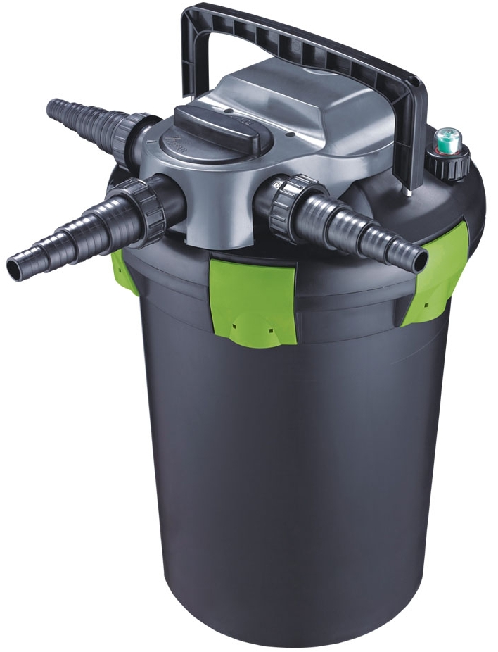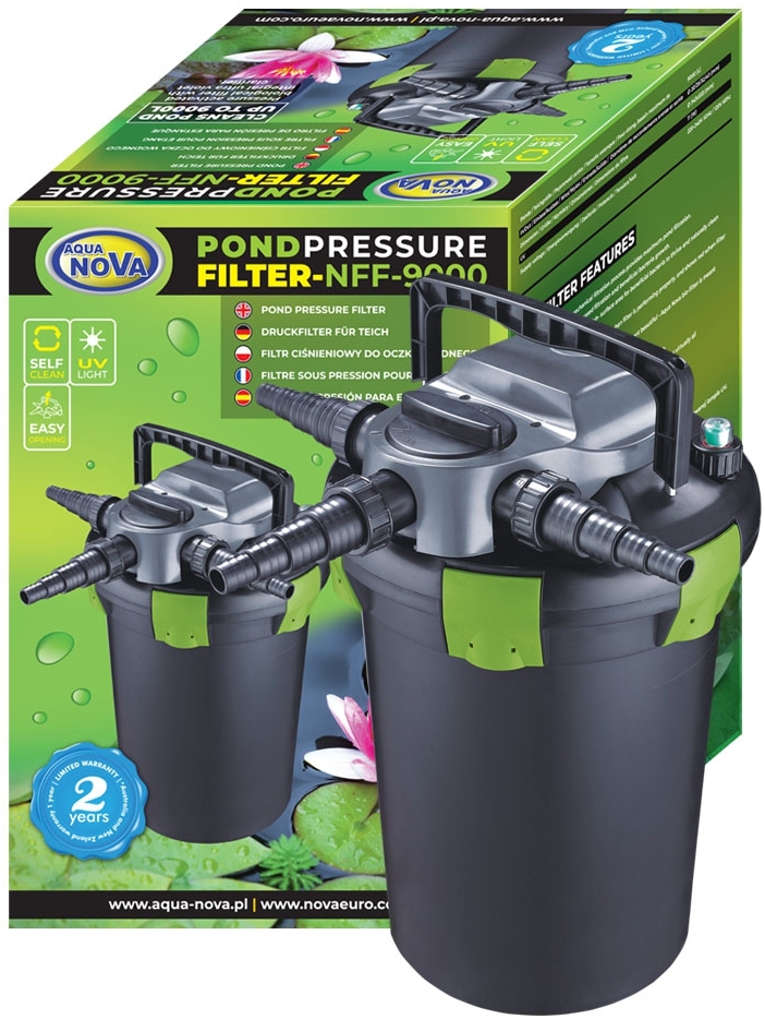 Tlakové filtry Aqua Nova NFF s technologií SELF CLEAN a možností snadného vyjmutí filtračních vložek. - Kombinace biologické a mechanické filtrace s integrovanou UV lampou, která účinně eliminuje řasy a zajišťuje křišťálově čistou vodu ve vašem jezírku. - Filtry jsou vybaveny technologií SELF CLEAN, která umožňuje průběžné čištění filtru bez nutnosti jeho otevírání. Speciální mechanismus čistí houby od největších nečistot a systémem SELF CLEAN jsou nečistoty odváděny samostatným výstupem. - Součástí sady jsou filtrační vložky (houby) a 3 konektory (20/25/32/40 mm) pro snadnou instalaci. - Indikátor nutnosti čištění filtru usnadňuje údržbu. - Jednoduchý systém otevírání krytu filtru umožňuje snadnou údržbu a čištění. - Indikátor provozu UV lampy zajišťuje správné fungování zařízení. - Křemenné sklo zabudované v UV lampě je vysoce kvalitní materiál, který propouští všechny ultrafialové paprsky, čímž zvyšuje účinnost filtru. - Filtr lze částečně zakopat, což umožňuje skrýt technické vybavení jezírka a zachovat estetiku prostředí. - Zařízení je navrženo pro udržení krásného a zdravého jezírkového ekosystému. Technické parametry: Doporčený max. objem jezírka: 9000 l Doporučený max. průtok: 3000 l/h Výkon UV-C: 11 W Objem: 27 l Ochrana IP 44 Kabel 6,2 m 240V